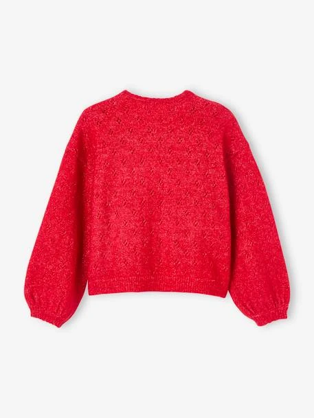 Gilet fille en maille ultra douce ajourée et irisée 68% acrylique, 29% polyester, 3% fil métallisé.