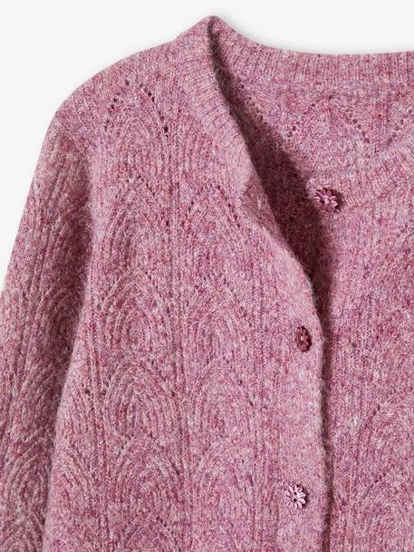 Cardigan fille en maille fantaisie ajourée ultra douce 54% polyester, 27% acrylique, 11 % polyamide, 2% élasthanne.