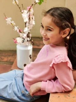 Sweat Motif Fleur Flocké Fille Volants En Broderie Anglaise Rose Bonbon – Vertbaudet