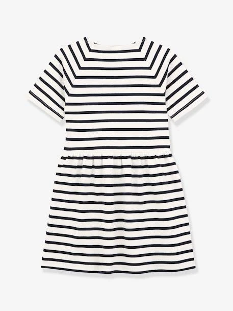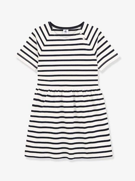 L’indémodable rayure marinière anime cette jolie robe en jersey de coton bien épais, matière iconique de Petit Bateau. Un essentiel facile à porter et féminin avec sa découpe à la taille et sa jupe froncée.