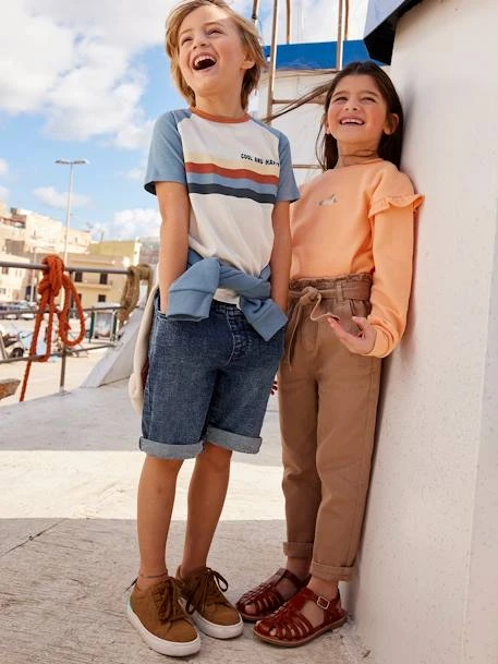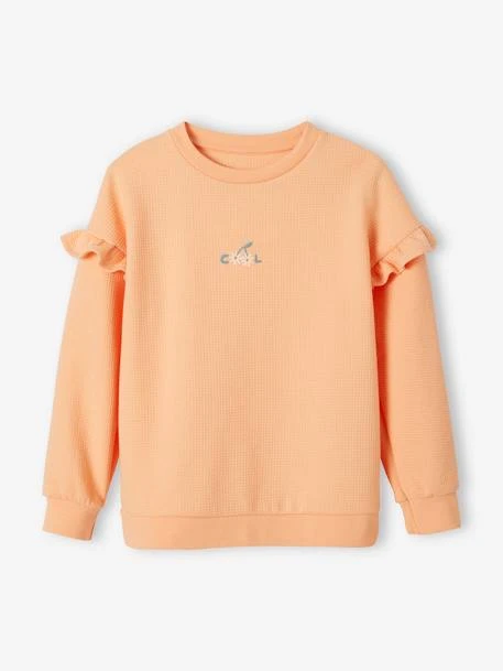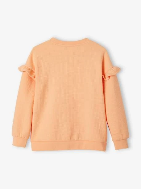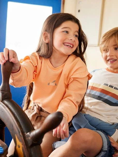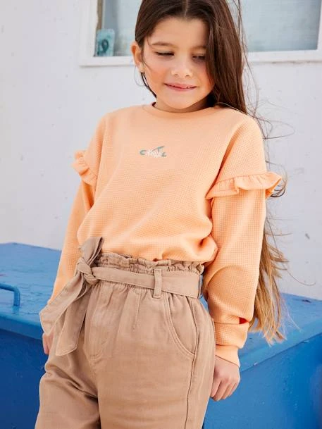 Le sweat adopte un nouveau style et une nouvelle matière ! Un coloris abricot pour une touche vitaminée et une maille nid d’abeille qu’on adore ! Nos stylistes ont ajouté des volants pour le bonheur de votre princesse. Une chouette idée pour renouler leur dressing.