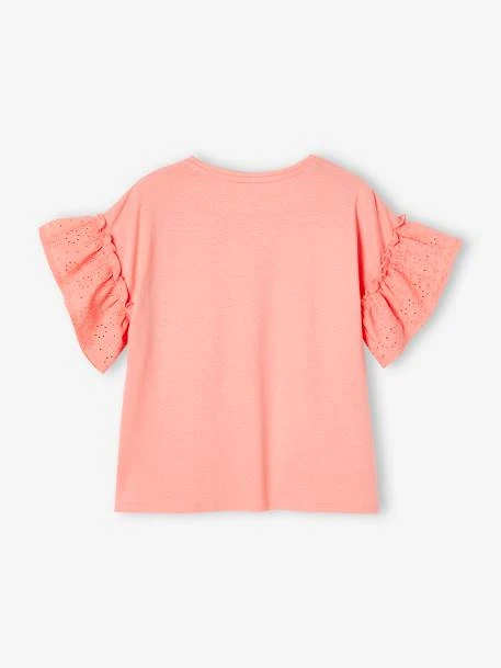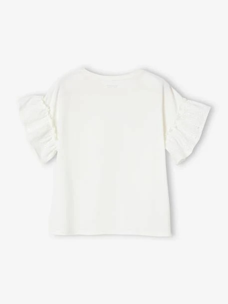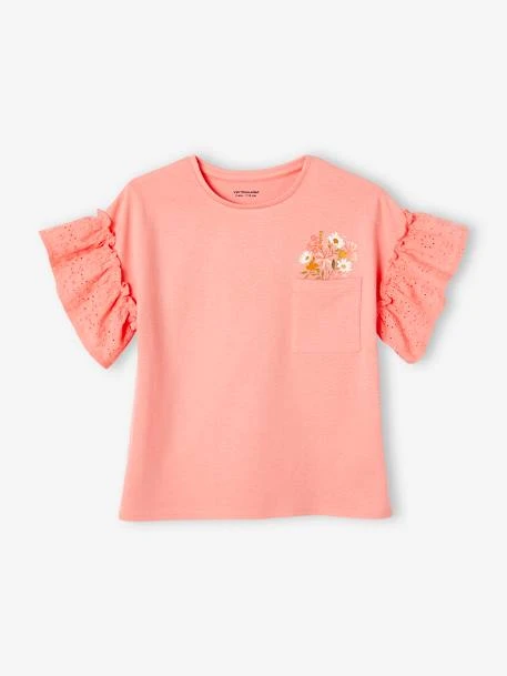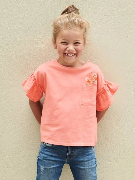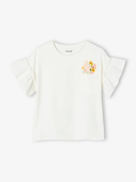 Un adorable tee-shirt indispensable pour apporter une touche romantique à leurs looks. Coup de coeur assuré pour les manches volantées en broderie anglaise. Détail charmant… avec petit bouquet de fleurs, la poche poitrine créée la surprise ! Il n’en faut pas plus pour craquer !