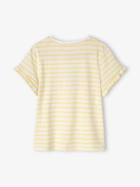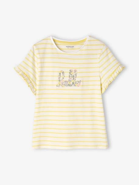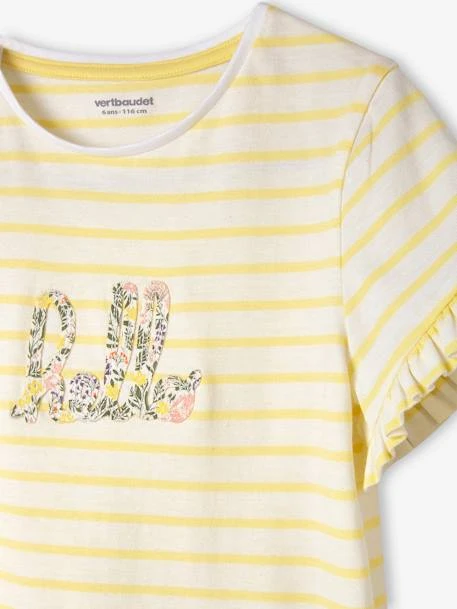 Des rayures qui vont faire des vagues et un joyeux message ! C’est le moment de craquer pour ce tee-shirt animé d’une inscription imprimée fleurs… On aime les manches soulignées de petits volants. A associer à un jean pour style bohème ou une jupe pour un look plus girly.